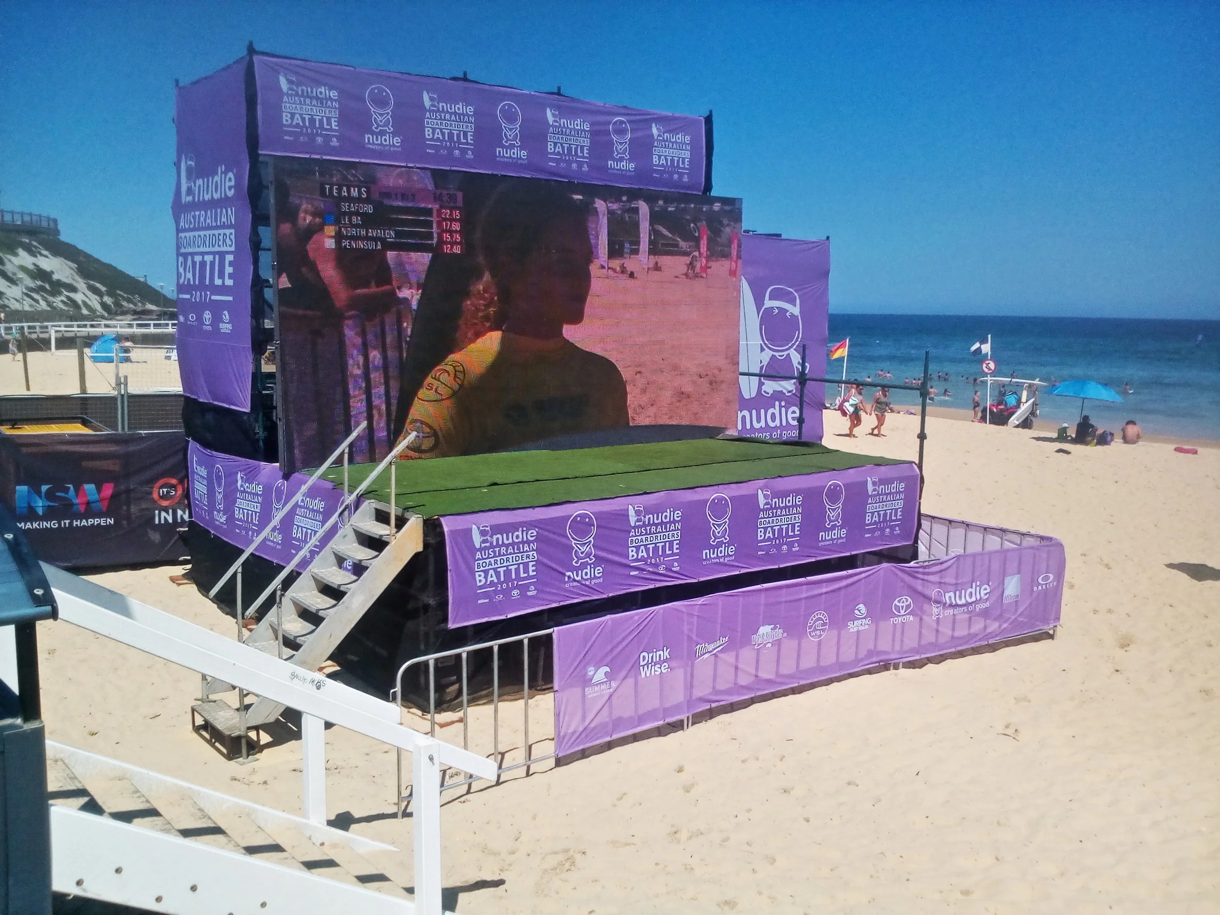 Stages and Towers built out of scaffolding are a great versatile solution for an unusual stage design or placement. A great example of the flexibility of a Scaffolding Stage Solution was at the Australian Boardriders Battle National Finals held on Newcastle Beach, where one Scaffolding structure was constructed to support the raised LED Screen wall for spectator viewing from across the beach. Built in front of the screen was a stage deck to be used for the presentation ceremony for the event and to the beach side was 2 platforms hidden by event scrim that supported two separate parts of the PA system.